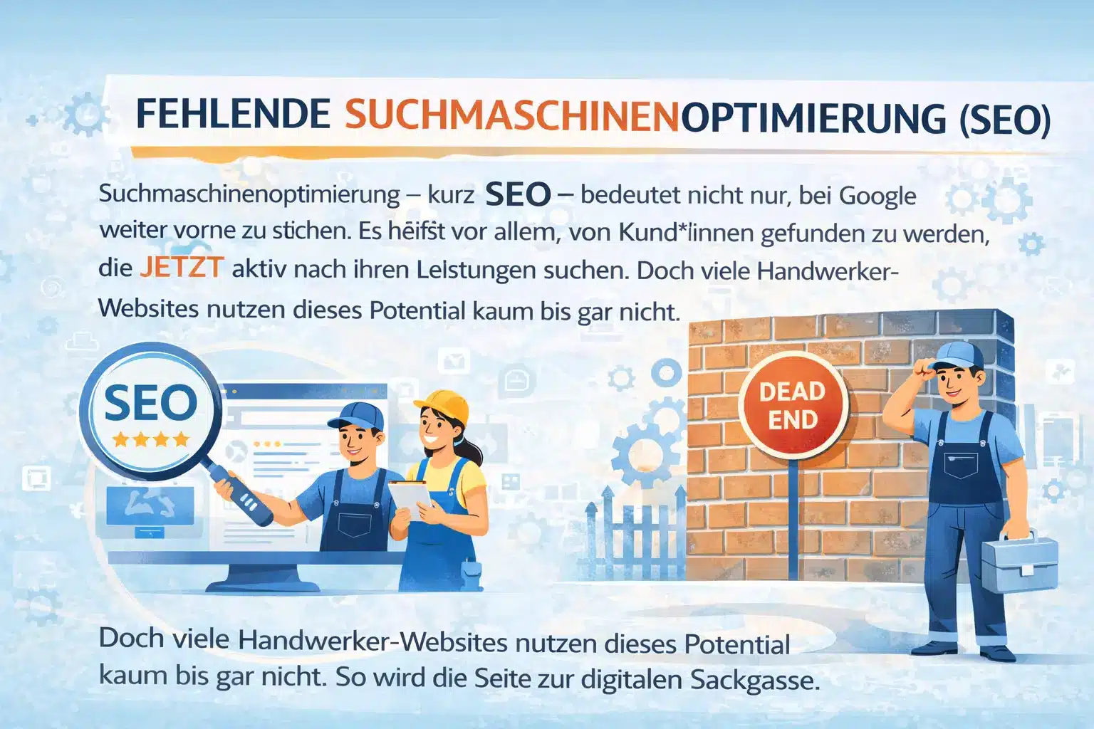 Suchmaschinenoptimierung – kurz SEO – bedeutet nicht nur, bei Google weiter vorne zu stehen. Es heißt vor allem, von Kund*innen gefunden zu werden, die JETZT aktiv nach Ihren Leistungen suchen. Doch viele Handwerker-Websites nutzen dieses Potential Handwerker Websites kaum bis gar nicht. So wird die Seite zur digitalen Sackgasse.